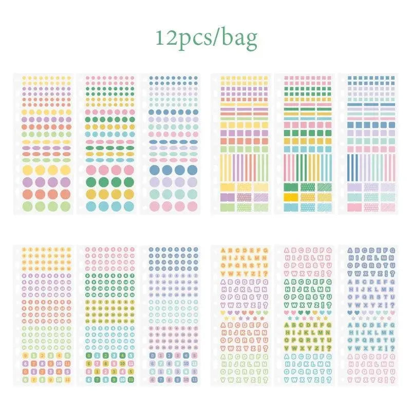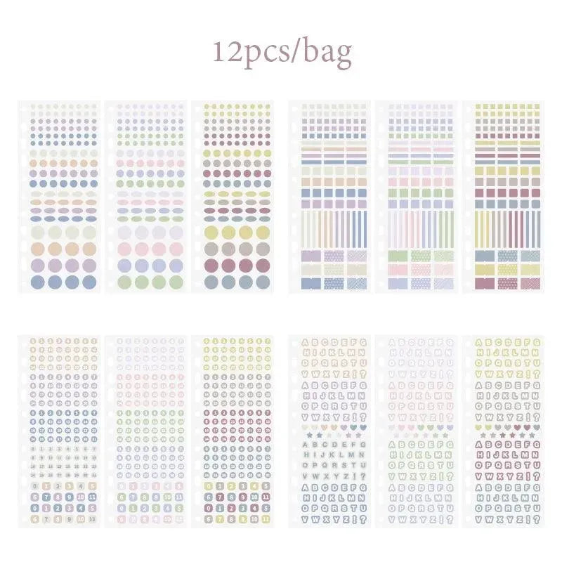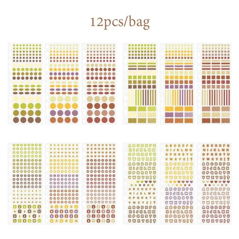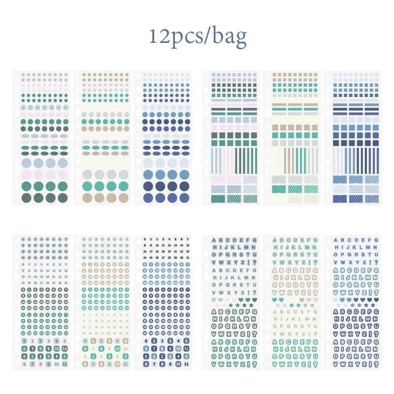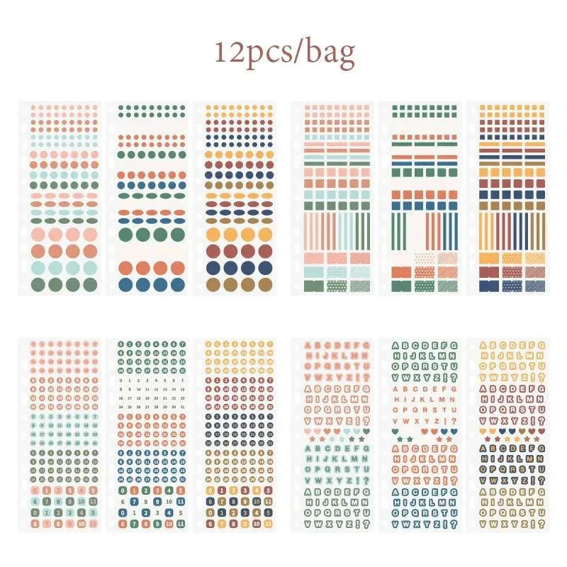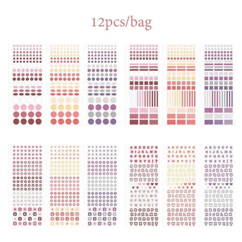 Each set contains 12 sheets filled with unique stickers, including numbers, letters, and various shapes, designed specifically for planners, calendars, and bullet journals. Made with high-quality adhesive paper, these stickers are perfect for organizing tasks, highlighting important dates, or adding decorative accents to your creative projects. With six beautiful color themes to choose from, there’s a style to match every mood and occasion.