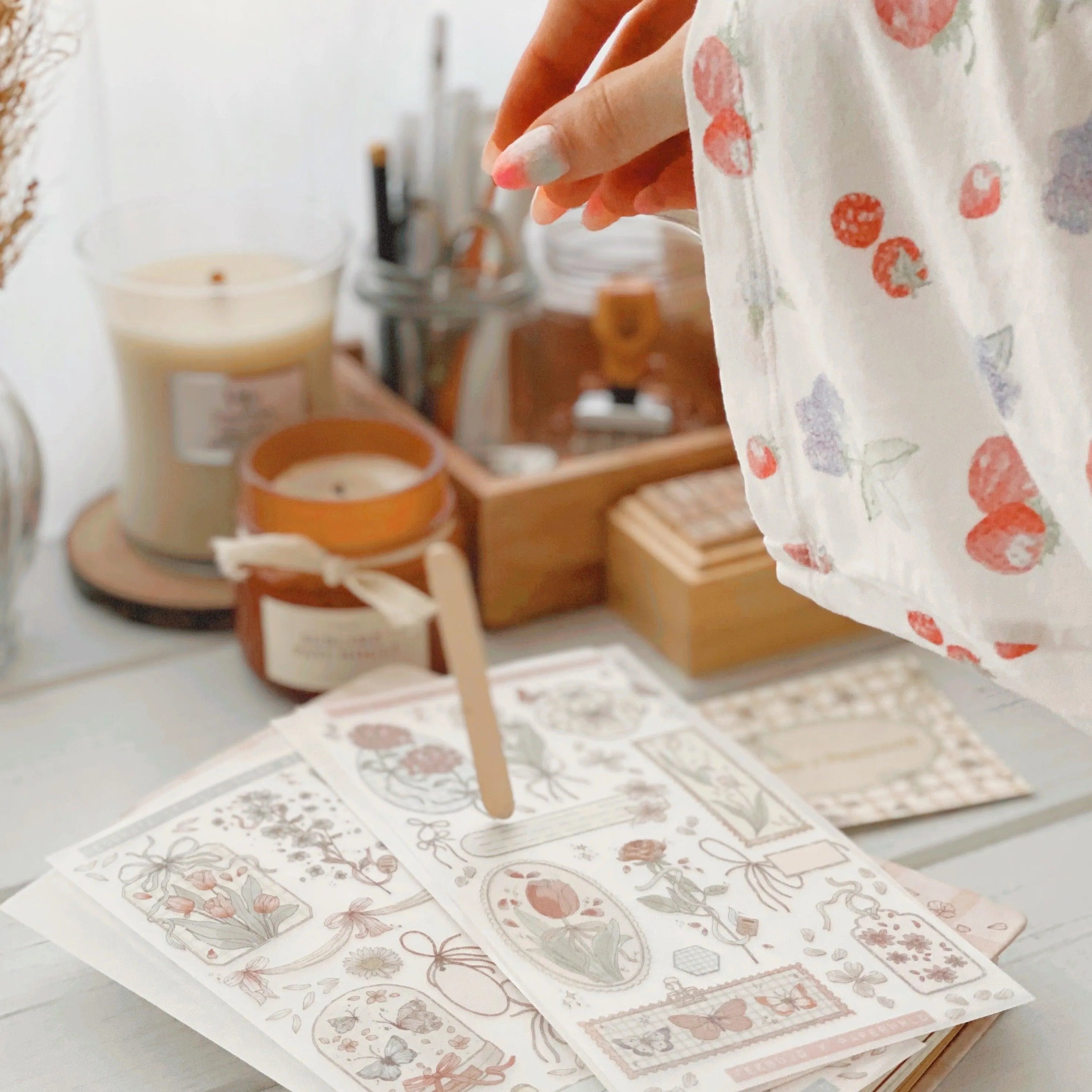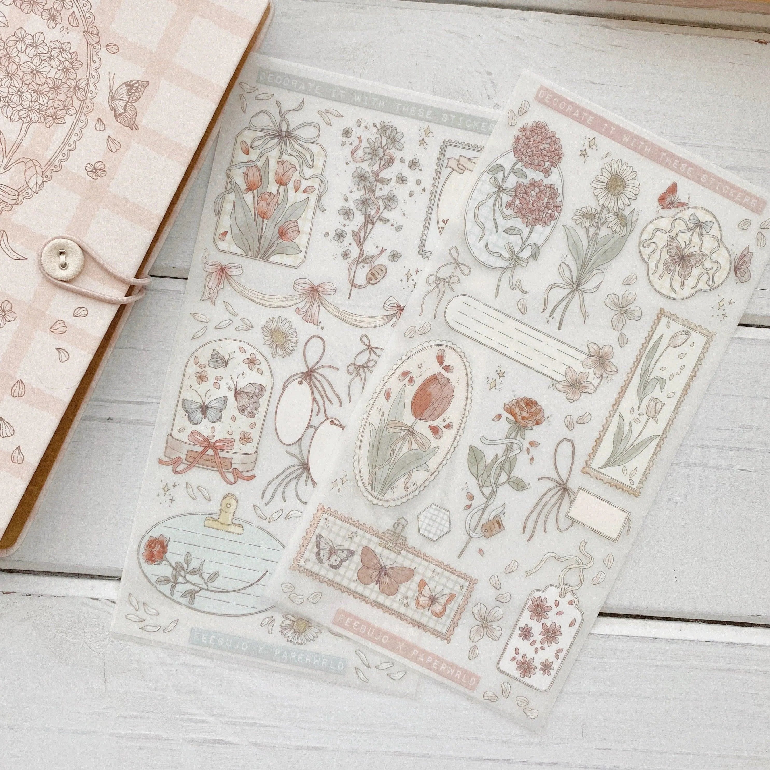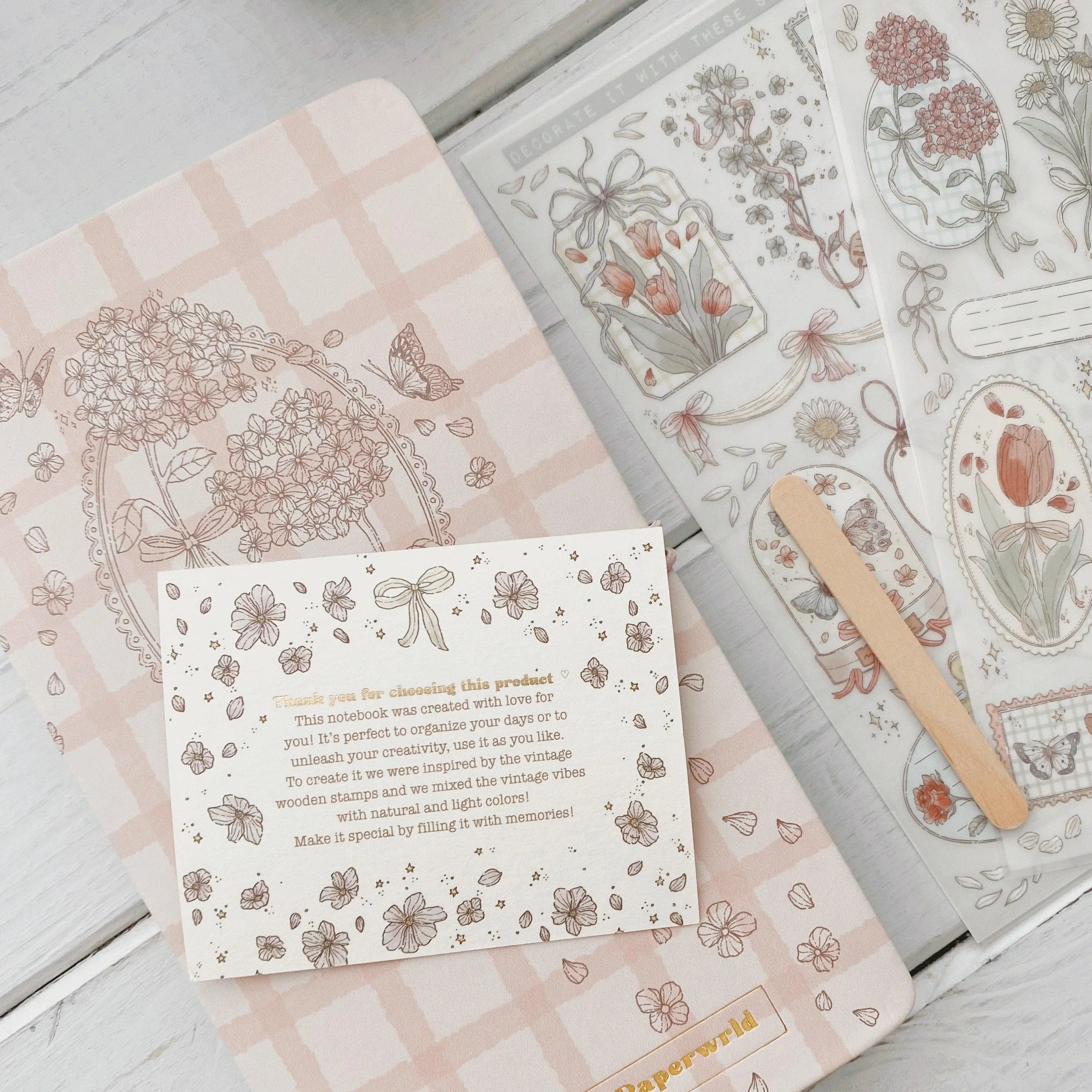 Exclusive Rub-on Stickers: Two sheets of unique rub-on stickers (11 cm x 21 cm) with a wooden stick for precise applications add a distinctive touch to each page.